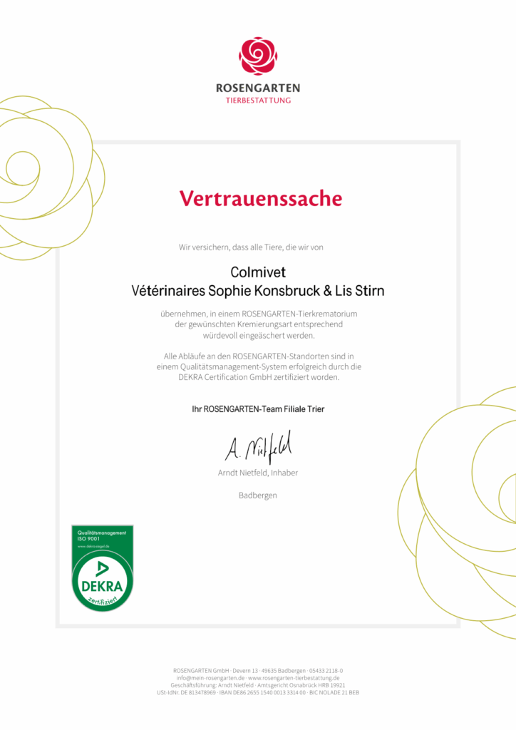 Nous vous accompagnons avec douceur, discrétion et respect, afin que ce dernier moment se déroule dans la plus grande tranquillité, pour vous comme pour votre animal adoré.