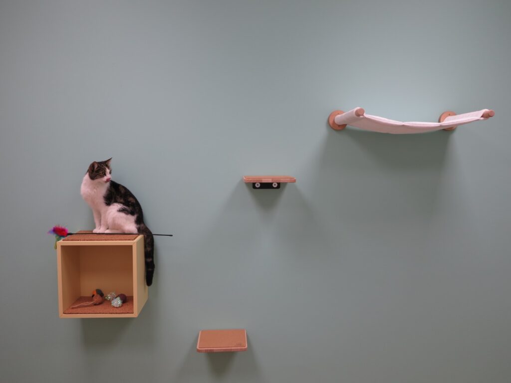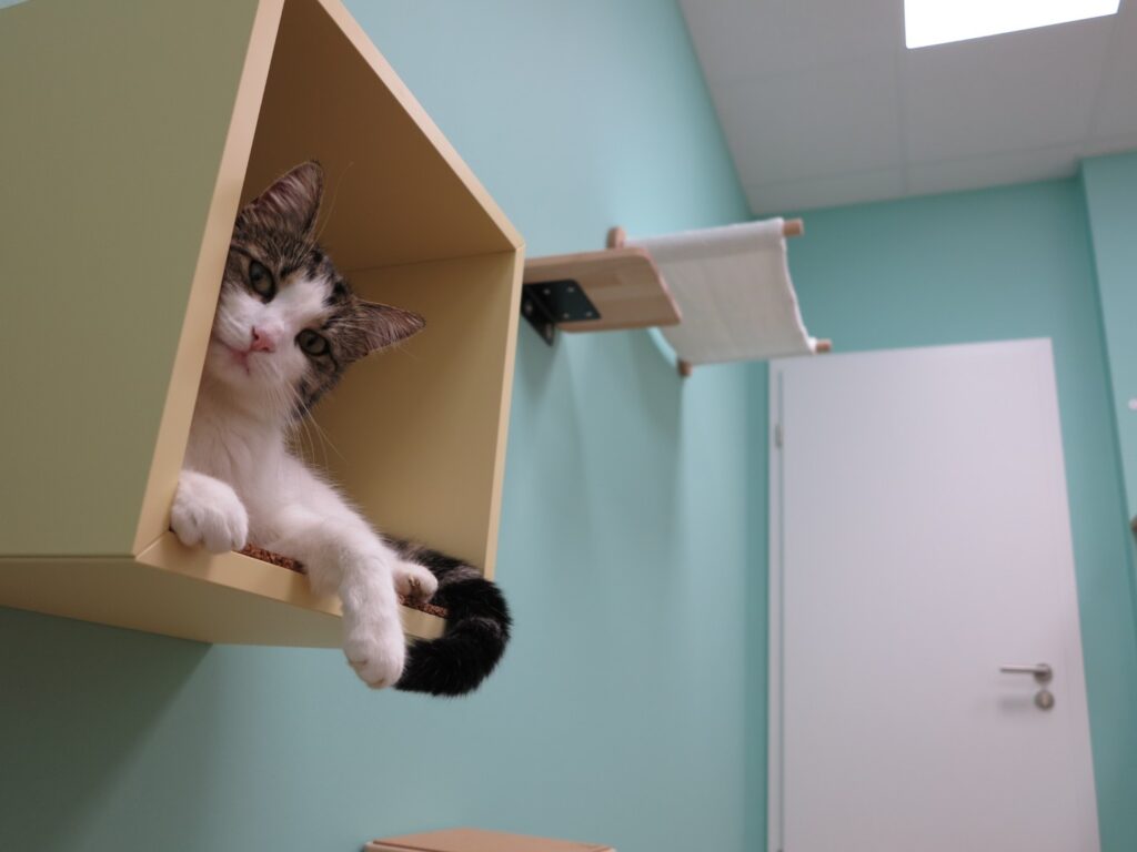 Dans la zone dédiée aux chats, les cages sont placées en hauteur et disposent de cachettes pour leur offrir un sentiment de sécurité. Nous utilisons également des phéromones apaisantes pour favoriser un véritable climat de bien-être.