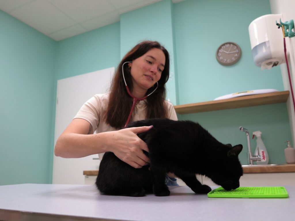 L’examen se déroule ensuite dans une ambiance sereine, toujours en douceur. Nous utilisons le renforcement positif et adaptons notre approche à chaque animal, afin de rendre ce moment le plus apaisé possible.